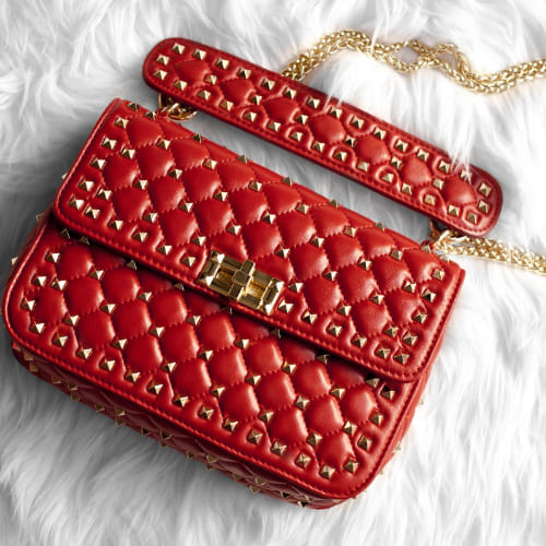 This piece catches the eye with its quilted surface and subtle studded details, offering a bold yet elegant alternative to classic handbags, perfect for adding a fashionable edge to both casual and formal outfits.